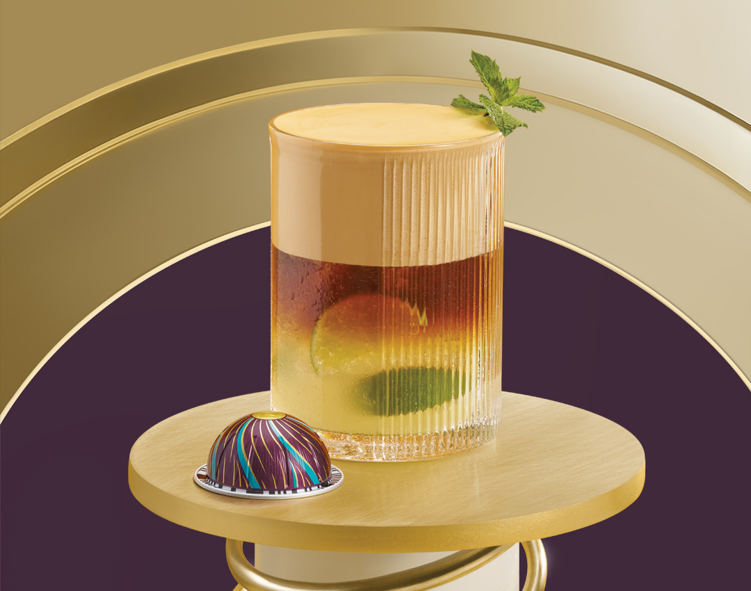 Refresh yourself with our zesty Ginger Lime Iced Coffee, featuring muddled lime and honey, topped with ginger beer and a splash of shaken coffee, garnished with fresh mint.