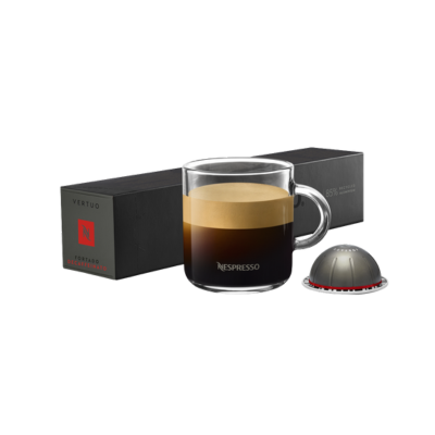 The most intense Gran Lungo Vertuo coffee, now decaffeinated. Fortado Decaffeinato’s Indian Robusta comes at you in full force, with cocoa and oak wood notes still strong in the decaffeinated Colombian Arabica.