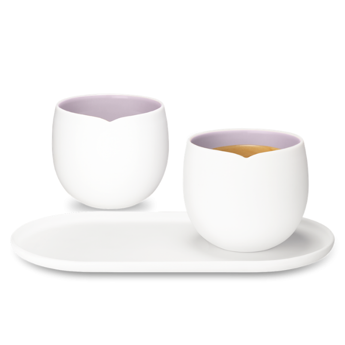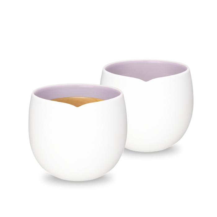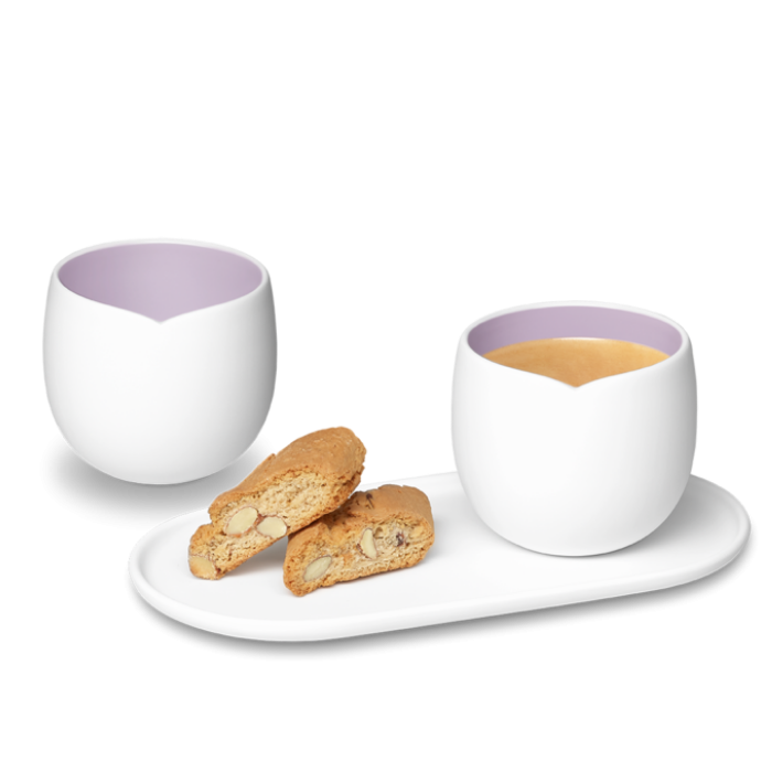 with a matte white exterior and a varnished lavender color interior. For coffee moments that take you back in time.