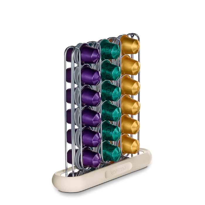 Šis elegantais kapsulu turētājs, ko izstrādājusi slavenā itāļu dizainere Federica Biasi, noteikti piešķirs šarmu jūsu kafijas telpām/acumirkļiem. Izgatavots no nerūsējošā tērauda turētājiem un mākslīgā travertīna pamatnes, tas ir ideāli piemērots jūsu iecienītāko Nespresso kapsulu uzglabāšanai, bet tā kompaktais izmērs stilīgi papildinās jūsu interjeru.