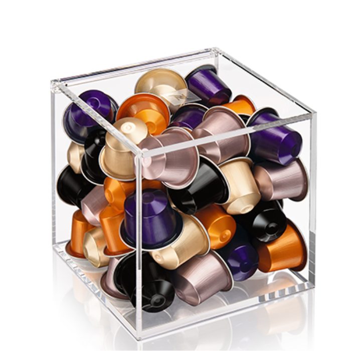 Caurspīdīgs kuba formas kapsulu turētājs no Plexiglas® ar 50 kapsulu ietilpību (pārdodams bez kapsulām). Svarīgs kafijas aksesuārs un elegants risinājums jūsu Nespresso kvalitatīvo kapsulu uzglabāšanai. Pateicoties kuba formai, šis no caurspīdīga materiāla Plexiglas® izgatavotais turētājs piešķirs papildus izsmalcinātību ikvienai virtuvei. Izmēri: 12,8 x 12,8 x 12,5 cm.
