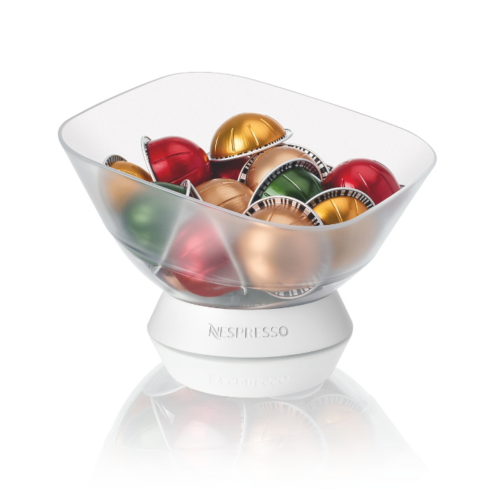 Caurspīdīgs kapsulu turētājs ar 60 oriģinālās sērijas kapsulu ietilpību. Materiāls: tvertne - PMMA (poli-metil-meta-akrilāts), pamatne - MMA (metil-meta-akrilāts).